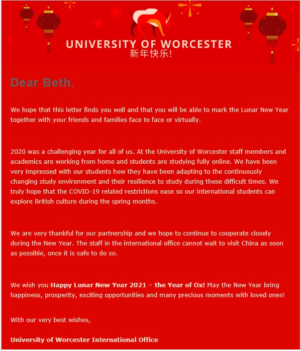 英国伍斯特大学发来贺卡:“祝贵校师生新年快乐,牛年大吉!2020年是充满挑战的一年,现在伍斯特大学的师生仍在远程工作学习。面对新冠肺炎疫情,我们赞扬学生们表现出的适应力和灵活性,也希望疫情能够尽快结束,生活恢复正常。同时,我们也感谢中国合作伙伴给予的支持,我们将在疫情结束后尽快访问中国。”